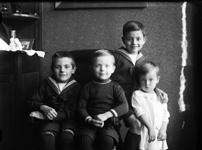 Vier van de zes Van der Hoeven-kinderen staan erop, twee ontbreken: Willy (mijn moeder) was onderweg maar nog niet geboren en van Adriaan (de jongste van de zes) ontbreekt nog ieder spoor.
