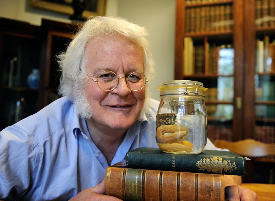 O’Hanlon, buitengewoon prettig in de omgang en very much a ladies’ man, was zo vriendelijk om even te poseren met zijn hagfish, in het Nederlands slijmprik genoemd. Een fascinerend diertje dat met zijn slijm een haai kan doen stikken. Het zit in een weckpot, wordt bij het reizen beschermd door de broek die O’Hanlon op dat moment niet draagt en komt bij elk optreden op de proppen, of de interviewer dat nou wil of niet.