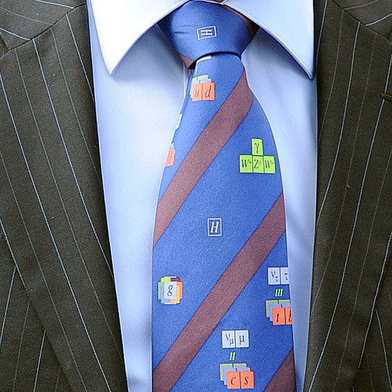 De das werd gemaakt in een oplage van 200. Hij is niet te koop, alleen te geef. Op zijn verjaardagsfeestje bijvoorbeeld, aan zijn gasten. Zelf draagt hij hem met veel plezier bij deze gelegenheid: de presentie in het Universiteitsmuseum van Utrecht van het boek ‘Tijd in machten van 10’, geschreven met met collega Stefan Vandoren – een aanrader.
