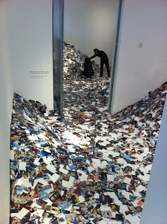 Foam viert dit jaar haar tienjarig bestaan en heeft onder de naam What’s Next? een project opgezet over de toekomst van de fotografie. De tentoonstelling The Future of the Photography Museum is sluitstuk van dit onderzoek én van Foams jubileumjaar. Vier curatoren maakten elk een tentoonstelling. Deze foto hoort bij de ruimten die Erik Kessels (KesselsKramer, Amsterdam) maakte onder de titel Fotografie in overvloed. 24 uur lang downloadde Kessels beelden van het internet. En hij printte ze allemaal. Het gevolg: bergen en bergen foto’s. Wat wil Kessels daarmee aantonen? Dat wij gebombardeerd worden met beelden, die daardoor betekenisloos worden, geloof ik. Het is misschien een beetje flauw om te zeggen dat we dat allang weten. Zonde van al dat papier.