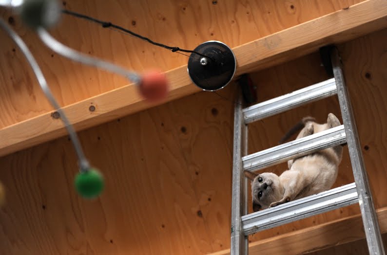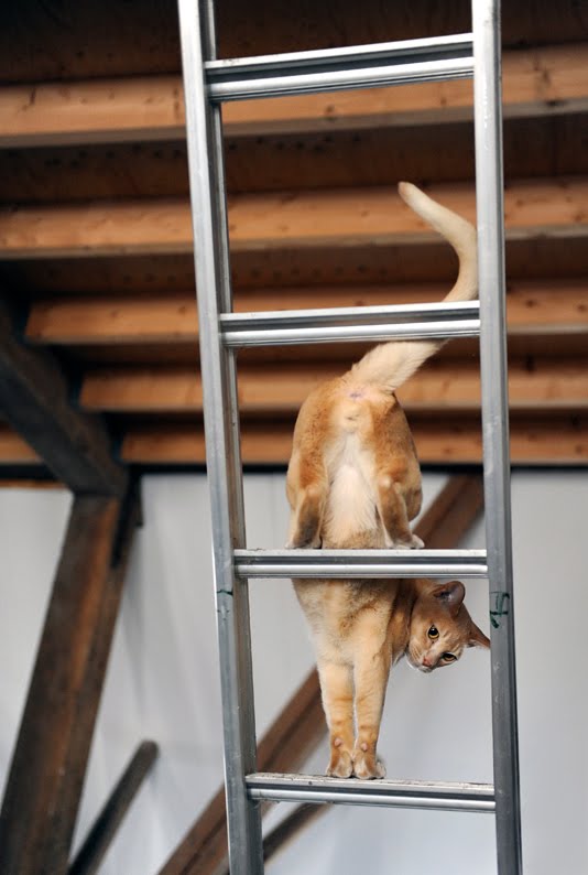 Een lamp op zolder – net boven het trapgat, op drie meter hoogte, moeilijk bij te komen – gaat verhuizen. Chick en Chucky zijn er meteen voor de porren; zij verkennen de situatie onmiddelijk. Omhoog is geen probleem – afdalen ook niet. Ze zijn allebei opmerkelijk handig in het afdalen. Er wordt vandaag niet naar beneden getuimeld. Omdat Chucky langere pootjes heeft, komt hij iets makkelijker de treden af. Maar Chick kan zich beter in bochten wringen!
