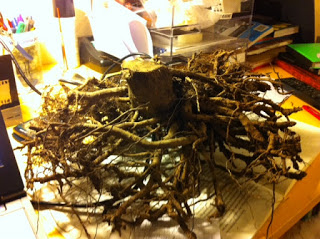 Een onverwacht cadeau – het wortelstel van een sering. Om omgekeerd in de vensterbank te leggen bij wijze van Puur Natuur. Een speciale verrassing van W., van wie ik nu vermoed dat háár vensterbanken uitpuilen van de seringwortelstelsels, al weet ik dat natuurlijk niet zeker.