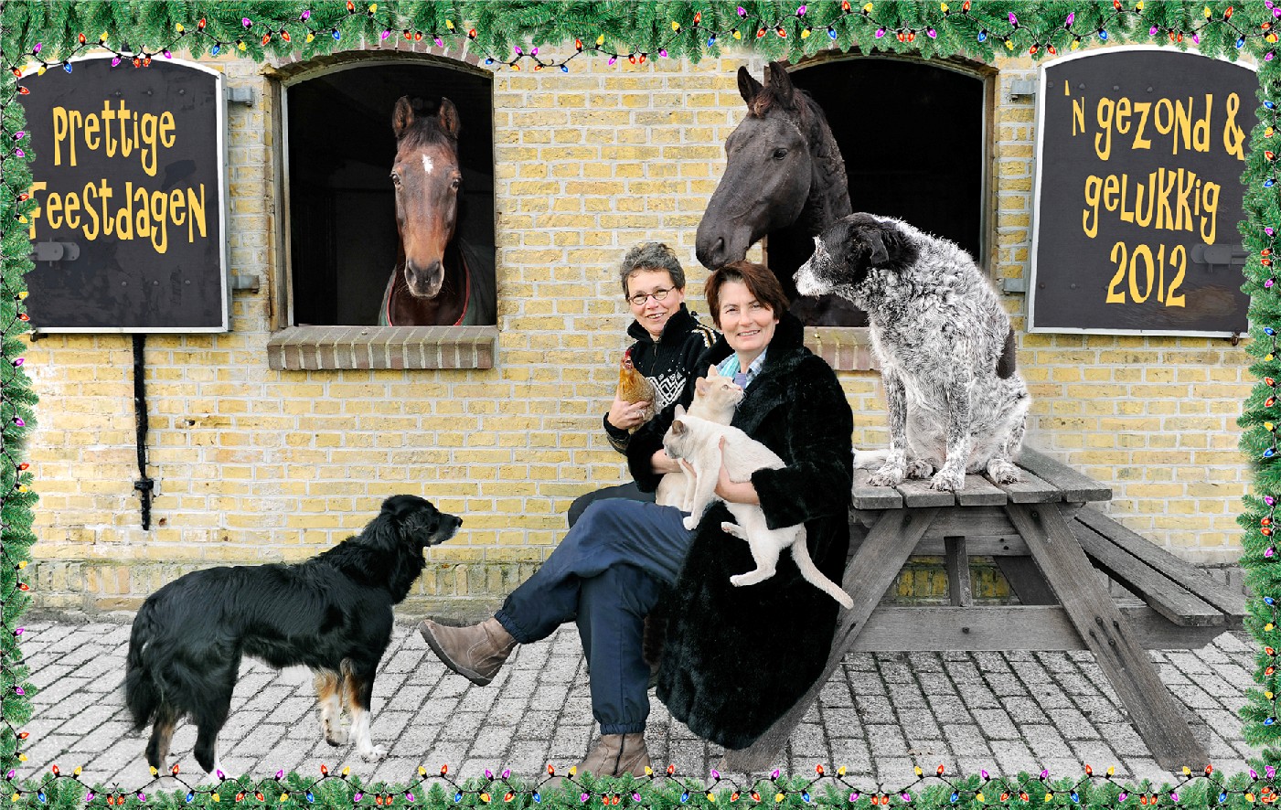 Je kunt het doen, je kunt het laten, maar elk jaar moet er toch weer dat Besluit vallen: Kaarten sturen? Geen kaarten sturen? En zo ja, wat dan? Er zit iets huiveringwekkends aan zelfgeknutselde kerst- en nieuwjaarskaarten. Enerzijds is het truttig, anderzijds toch-ergens-best-wel-hartverwarmend. We gaan voor dit jaar wederom voor de hartverwarmende truttigheid. In dit geval een groepsportret met dieren. De aandachtsboog van de meeste beesten is fors korter dan die van een drie-jarig kind, dus met 7 beesten op de foto gaan is een uitdaging. Na het indrukken van de knop had ik 5 seconden om terug te hollen, plaats te nemen op de bank en de katten te belemmeren om te ontsnappen. Maar dat het resultaat een soort van zootje is, was ook de bedoeling.