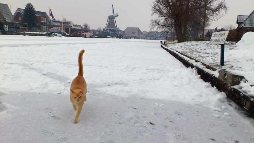 Voorlopig valt het wel mee: het ijs is dik genoeg om een personenauto te dragen. En Chucky zit nu te mauwen voor de deur van de sauna. Warmte bevalt hem nog altijd beter.
