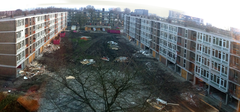 Actie achter de Plesmanlaan! De flat achter de rechter flat (buiten beeld) is al getransformeerd tot een puinhoop.Dat slopen gaat per gebouw. Aan de flat links kun je nog niet zoveel meer zien, behalve dat er stapels losgerukte planken en ander houtwerk op de grond liggen.