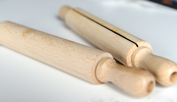 Twee ravioli-deegrollers (14 cm rol en 2 x 4 cm voor de handvatten) van kookwinkel Duikelman in de Ferdinand Bolstraat. De gleufjes zijn er met een klein slijptolletje ingedremeld, na enig oefenen op een stukje bezemsteel.