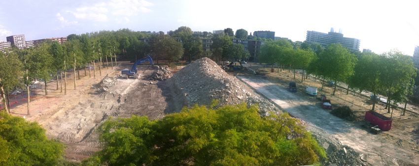 De flatgebouwen zijn weg – wat rest is een nieuwe heuvelrug in het midden. De flats helemaal links (achter de bomenrij) zijn nu ook verdwenen. Voor de ontstaansgeschiedenis, klik hier.