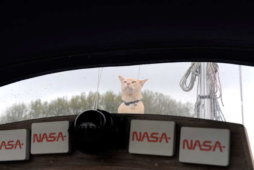 Chick en Chucky sprongen op het laatste moment baldadig aan boord, maar werden wat onzeker toen de oever van ons weggleed. Het uur daarop hebben ze constant rondgewandeld, -gesprongen, -gesnuffeld en -gehold, naar het leek in lichte staat van verbijstering. Tot we weer bij de boerderij aankwamen en ze met een elegante boog op de vaste wal sprongen.