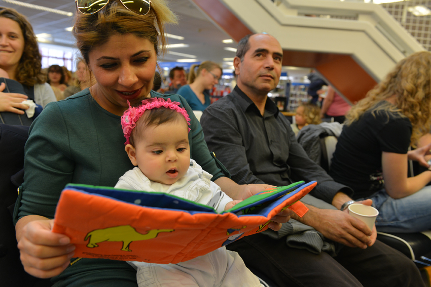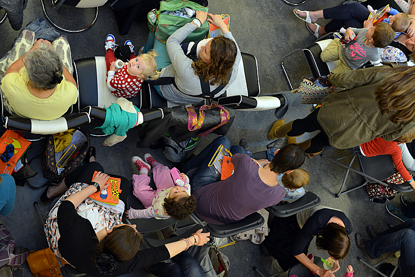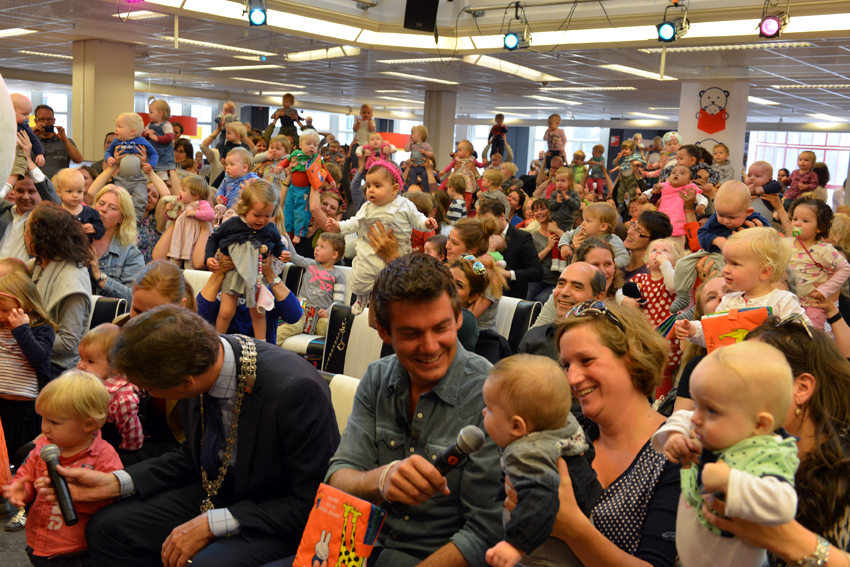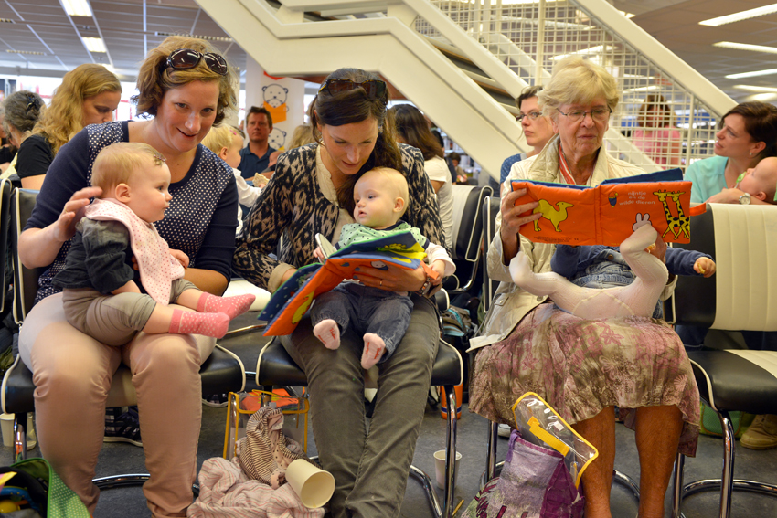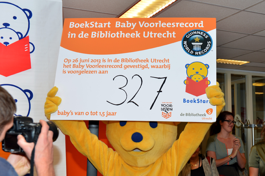 Drie van de 327 babies tussen 0 en 18 maanden die vanochtend bij elkaar waren in de Openbare Bibliotheek Utrecht om met het Voorleesrecord voor babies in een Guiness World Record te vestigen. Dat was een uitdaging omdat er werd voorgelezen uit het babyboek van het jaar: Nijntje en de wilde dieren; daarin staat behalve de titel helemaal geen tekst.
