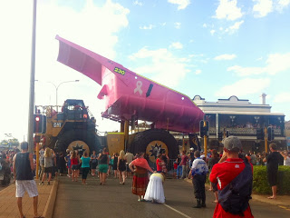 Kalgoorlie is een mijnstadje en dat willen ze weten ook. Iedereen loopt en rijdt mee in de jaarlijkse Kerstoptocht (van kleuter tot bejaaarde) maar het Piece de Resistanceis de onwaarschijnlijk grote truck die hier in de mijn wordt gebruikt. Deze ‘ Super Pit’ is de grootste open mijn ter wereld en alles is er Onwaarschijnlijk veel en Onwaarschijnlijk groot. De monstertruck – netjes gewassen voor de gelegenheid – heeft wielen waarvan de as net boven mijn hoofd uitkomt. Hij is roze geverfd uit solidariteit met Breast Cancer Awareness – een luid en duidelijk signaal lijkt me.