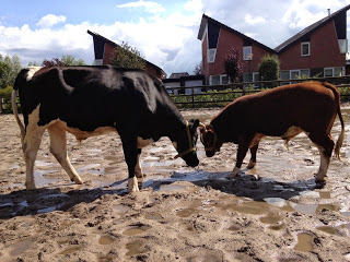 Vanochtend zijn Willy Drie en Gerrit voor het eerst samen in de bak geweest. Willy Drie huppelde van opwinding, Gerrit vond het ietsje minder en liep meestal voor Willy uit. Maar af en toe draaide hij zich toch om en ging de uitdaging aan. Straks krijgen ze allebei vers gras; Inge is het al aan het maaien. Als de grond ietsje droger is, gaan ze naar het weitje.