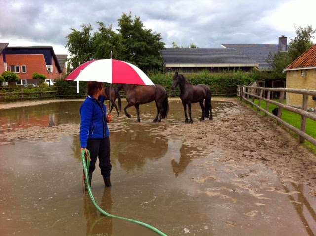 Het is nu weer even mooi weer maar twee weken geleden stond de bak nog blank. Er was zelfs zoveel water dat we besloten om het weg te pompen. Terwijl de regen weer zacht begon te vallen, stond ik met de afzuigslang voor paal. Nodig omdat je geen zand wil wegpompen en het water wel over een groot oppervlak verspreid was, maar niet heel diep. De paarden vonden het wel gezellig.