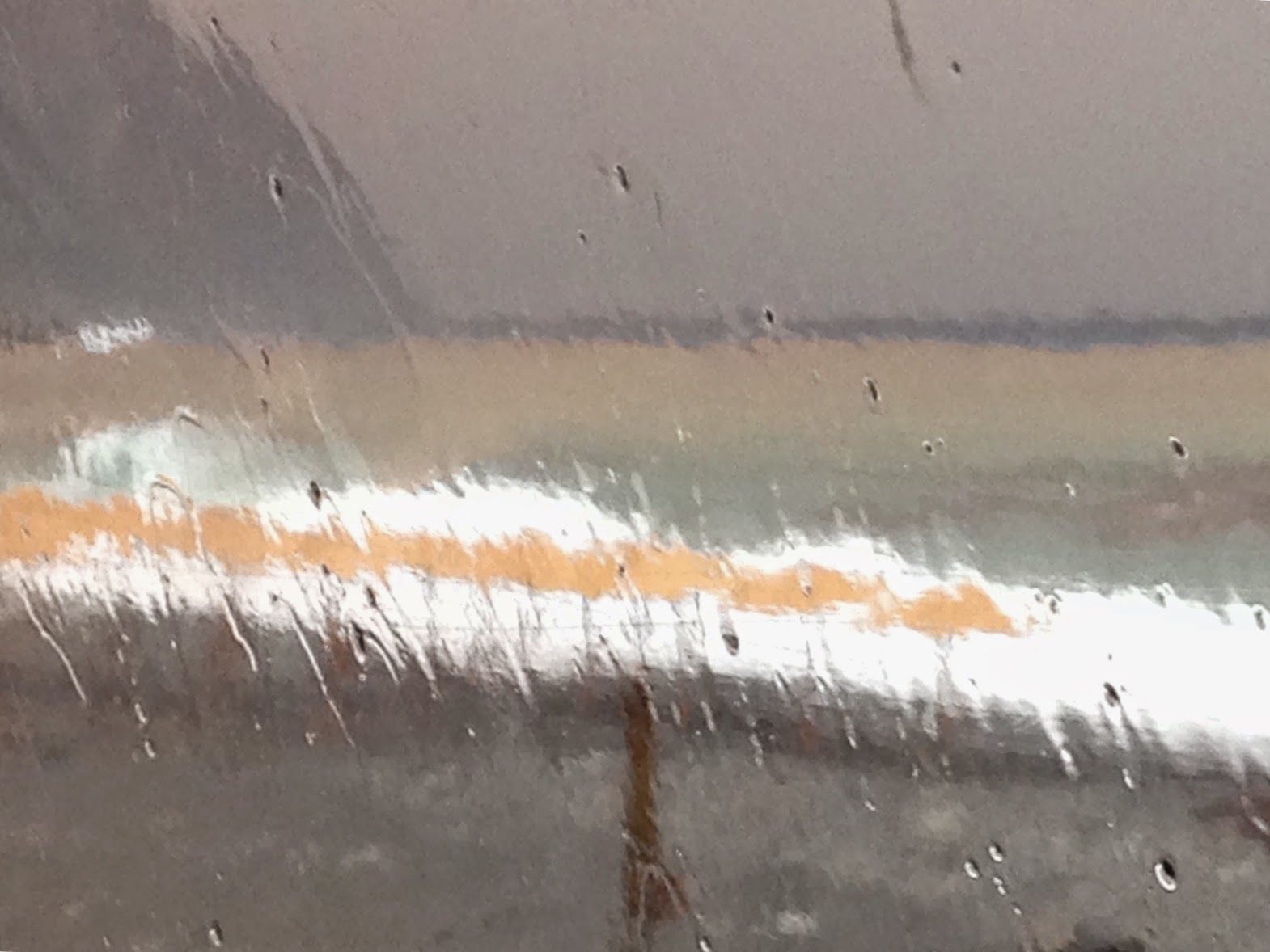 Today was a rainy day. The river was wild and yellow. So here you see (top to bottom): sky, dark sea, sea discolored by mud from river, green sea, white waves, yellow sunshades. Grey pennle beach. All seen from behind the plastic window from beach café).