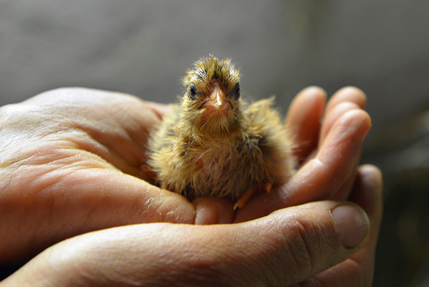 Wij moedigen het kuikentje aan. Ginni piept zelfs kips.