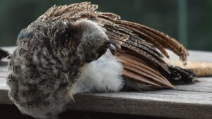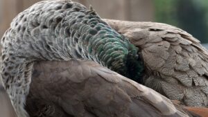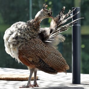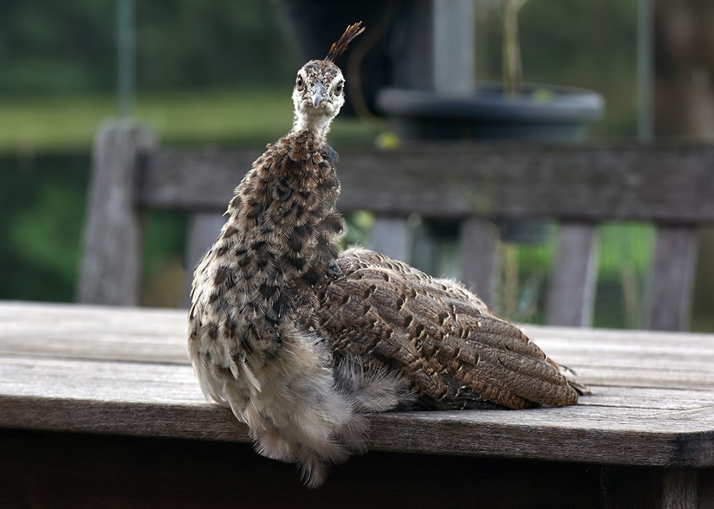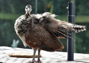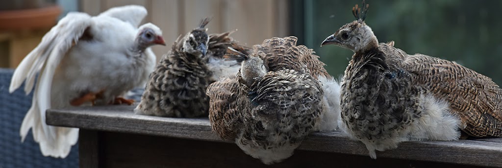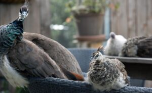 De pauwtjes doen het goed. Moeder en kinderen zitten graag en veel op op het terras.