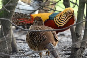 De Jonge Meneer sprint van het ene naar het ander fazantenvrouwtje. Hij blaast, tjirpt en sist. Hij draait om ze heen, zijn verenkap uitgezet als een waaier, strekt zijn pootjes en maakt zich zo hoog en groot mogelijk. Maar dan moet hij snel door naar het volgende vrouwtje,want hij wil ze alle zes bezwangeren. Dat moeten ze dan eerst wel goed vinden, dus hij blijft enorm zijn best doen: ‘Hier ben ik! Kijk naar mij! Hier ben ik! Kijk hoe mooi! Hoe groot! Hoe vruchtbaar en woest aantrekkelijk ik ben!’  ‘Jaja,’ denken de vrouwtjes. ‘Het zal wel. Ga nog maar even door.’ En De Jonge Meneer geeft het niet op: