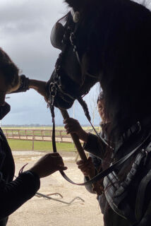 Inge rijdt kar en paard naar de schuur. Daar krijgt Hayke een praam om de neus – dat is een stok met een lus eraan die om de neus van het paard wordt gedraaid om haar rustig te houden. Het ziet er niet prettig uit, maar in deskundige handen werkt het op bepaalde drukpunten en zorgt zo voor stressverlagende endomorfine. Gelukkig voor Hayke mag ik de praam niet hanteren. Het werkt goed.