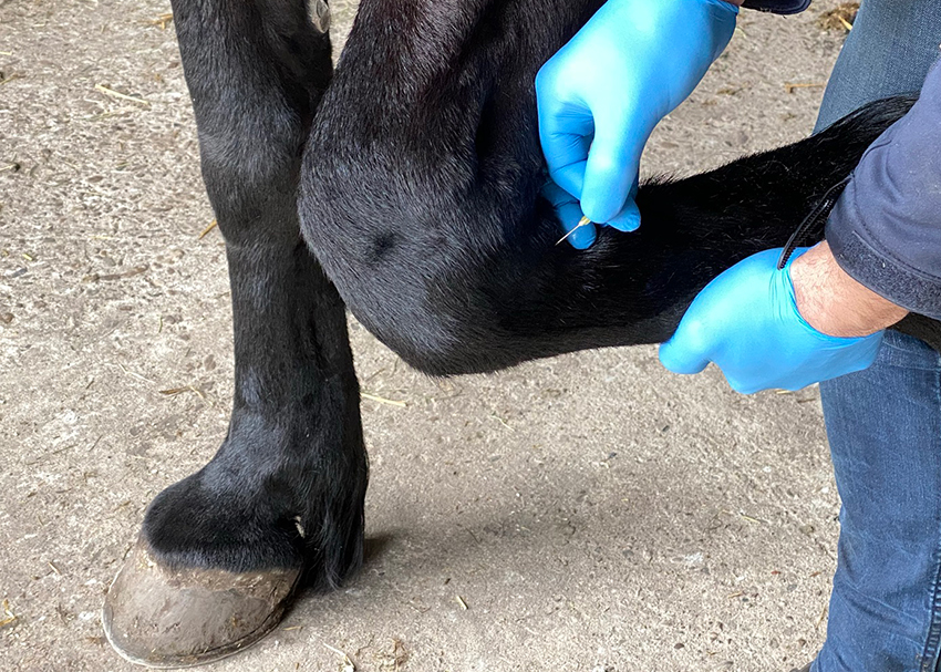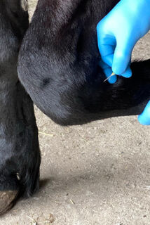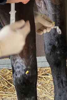 Dokter Wim geeft haar een aantal verdovende injecties in de zenuwen bij het hoefgewricht. Een paar minuten later gaat Hayke weer naar de bak om voltes te draaien. Hip. Hip Hip. De pijn zit dus niet in het hoefgewricht. Terug naar de schuur, kar uit de weg, praam erop en nieuwe verdoving erin, nu iets hoger in het been. Dokter Wim werkt secuur en doelgericht. Hij doet het duidelijk niet voor het eerst.