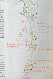 (Inge had haar oude leerboek erbij gehaald. De verdovende prikken werkten vooral op de zenuwen -ook die van mij- maar de ontstekingsremmende injectie was voor het gewricht.)