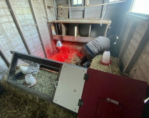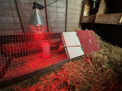 Een kuiken dat uit het ei komt, heeft voldoende energie om het een dag zonder eten en drinken uit te houden, maar daarna moeten er echt wel voedingsstoffen in. Wij zetten dezelfde avond kuikenvoer en water klaar. Er kwam een warmtelamp, en we legden hooibalen en stro voor isolatie – het oude kippenhok is nogal tochtig. Na een ingeving zette ik ook de bewegingscamera neer om te zien wat er allemaal gebeurde als wij er niet waren.