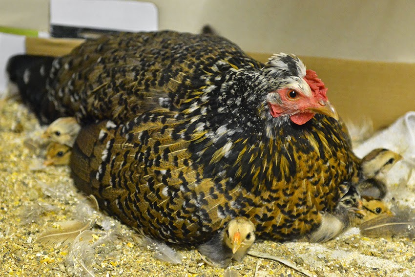 Hier is alles nog rustig. Punkeltje zit op haar zeven kuikentjes – 6 kuikenkoppies piepen onder haar uit. |