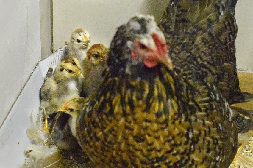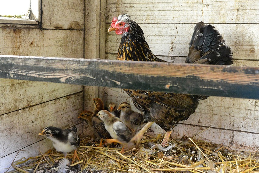 Rullie en Punkeltje hebben drie weken langs als maniakken gebroed. Acht eieren werden gemerkt, de overige (de andere kippen bleven er er elke dag fanatiek eieren bij leggen) zijn dagelijks verwijderd. Gisteren hebben de dames er nog een ei het nest uitgekukeld. Kennelijk te licht bevonden. Zeven eieren over. Twee daarvan zijn vandaag uitgekomen. De komende dagen zullen er nog wel wat broertjes en zusjes bijkomen.