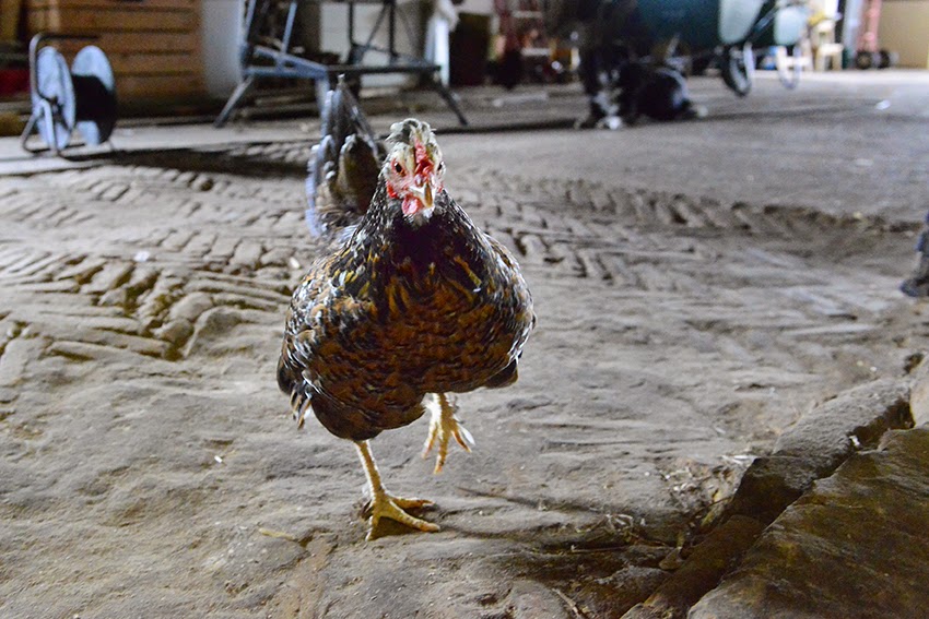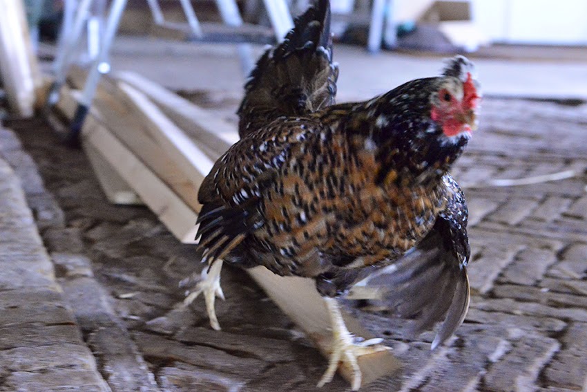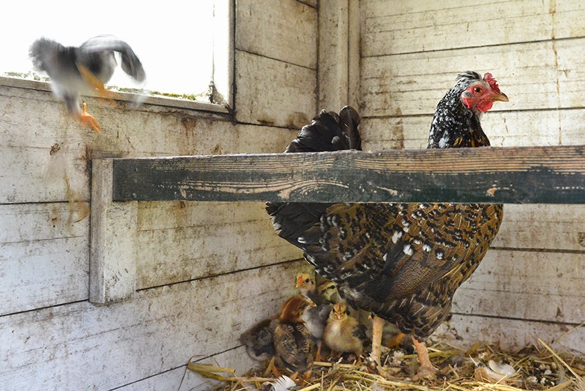 Punkeltje was met de zeven kuikens die ze heeft uitgebroed ondergebracht in een beschut plekje in de schuur. Maar het weer werd beter en we wilden moeder en kinders naar een (aparte) plek in het reguliere kippenhok verhuizen. Dat klinkt eenvoudiger dan het is. Als je aan haar kroost komt, verandert Punkeltje in een soort Maori strijder: ze vliegt je aan. Wij haalden diep adem en gingen aan de slag.