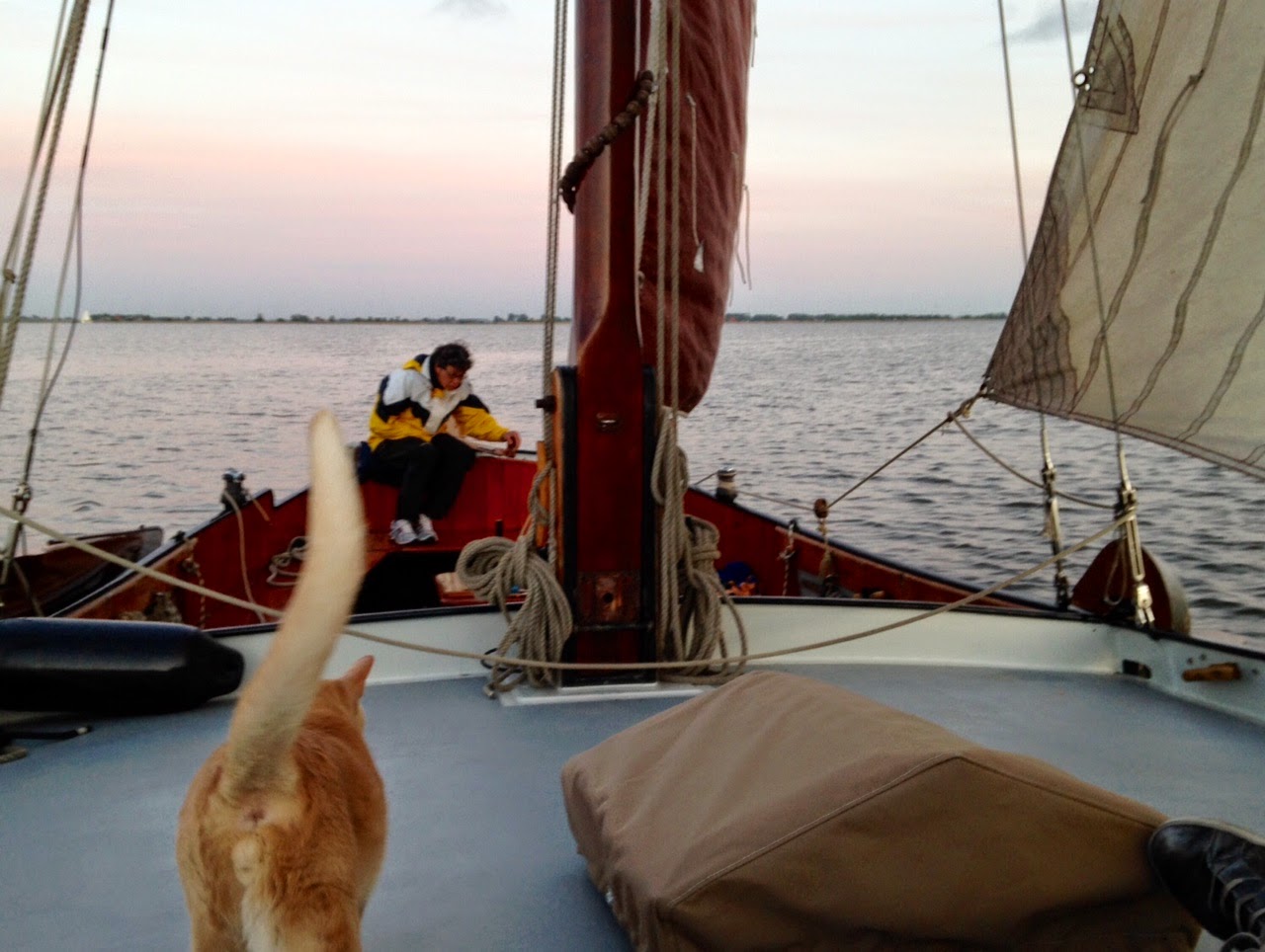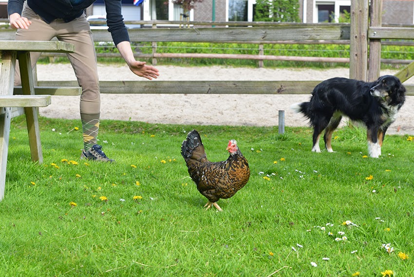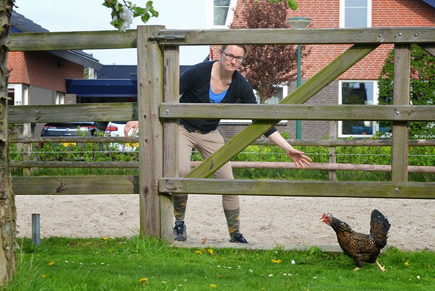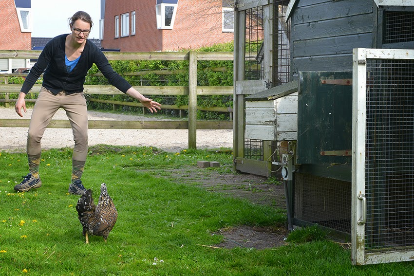 Wij moedigen het kuikentje aan. Ginni piept zelfs kips. |