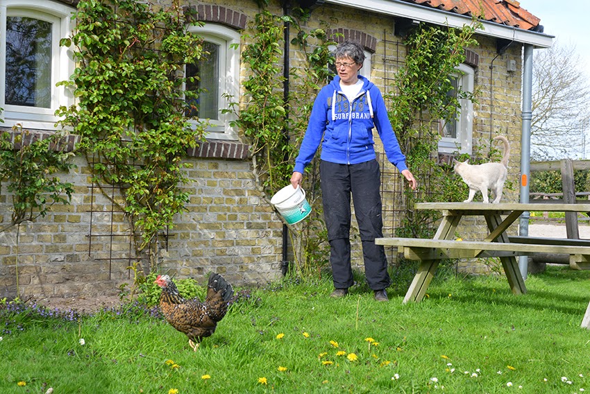 Terwijl Inge de kuikens voorzichtig in een doos doet, blijft Punkeltje aanvallen.. |