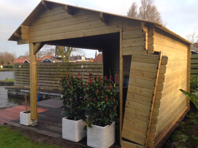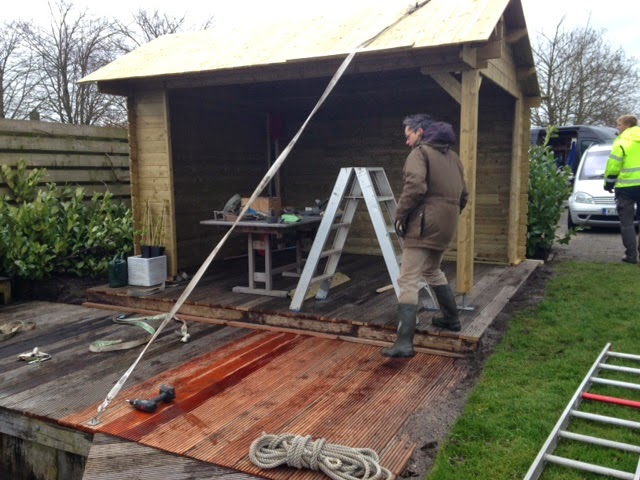 Wat zijn wij blij met onze kapschuur – en wat zijn we er snel achter gekomen dat de bouwinstructies van Gamma niet helemaal volledig waren. In de wereld van Gamma waait het misschien ook nooit zo hard. De wanden van de schuur liggen gestapeld. Daar is geen schroef aan te pas gekomen en daardoor ging het mis. Bij de snoeiharde wind vannacht is het dak een beetje opgetild en daardoor kwam de achterwand er deels uit.