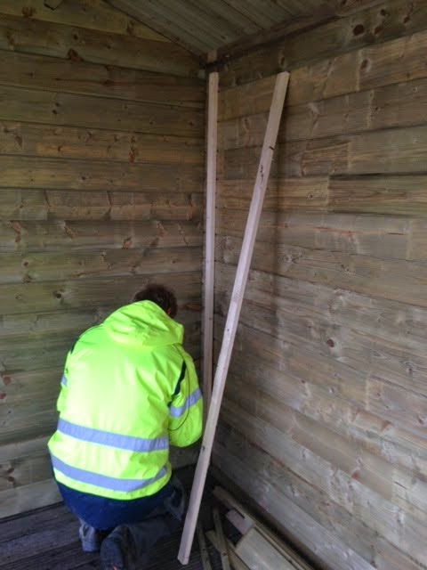 Maar wij hebben ons geheime wapen: Wander & Co! Al voor negen uur is er geschroefd en gesjord en staat de schuur een stuk stabieler.