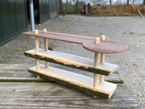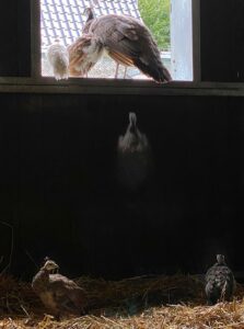 De pauwtjes kunnen vliegen, maar niet steil omhoog en het is nog even rekenen en mikken hoe steil de hoek kan zijn waaronder je het doel aanvliegt. De stal is een perfecte plek om te oefenen, behalve als de Mens binnenstapt. Amalia, Witje en pauwenkuiken 1 zitten op de vensterbank, pauwenkuikens 3 en 4 in het stro. Nummer twee probeert bij zijn moeder te komen – deze poging is tevergeefs. Hij stond nog te dicht bij de muur om de vensterbank te halen.