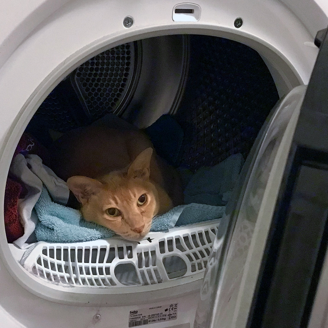 Bekaf van de kerstdagen? Chucky heeft een nieuw genotsmomentje: de droger als-ie net klaar is en de deur is opengezet om het schone wasgoed wat te laten afkoelen. Niemand is zo dol op schoon warm wasgoed als katten. Dit is nog leuker dan op de handdoek tijdens het strijken. Het verschil: bij het strijken stoort hij. In de droger wordt hij gestoord.