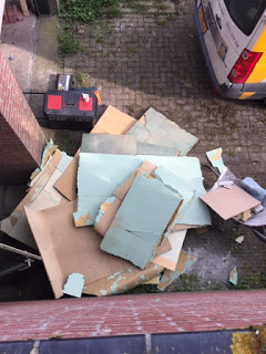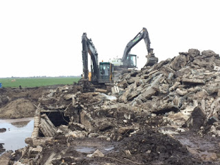 In de achtertuin wordt het beton in kleinere brokken gebroken. |