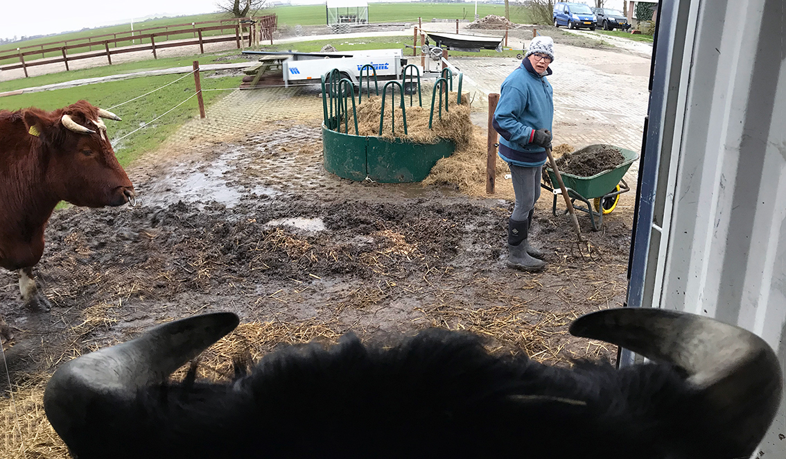 Willy Drie staat tevreden in de container – zojuist gevuld met vers stro. De wind is oost, akelig en koud, maar er zijn buiten genoeg plekken om uit de wind te staan. Zowel Willy Drie als Gerrit hebben een dikke vacht en kou deert ze niet. Ze kunnen tegen een stootje. En in de container is het helemaal comfortabel. Willy Drie staat te herkauwen en kijkt hoe het buiten weer schoon wordt. Leuker dan televisie.
