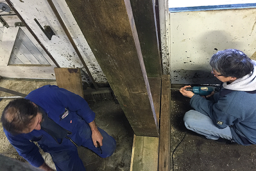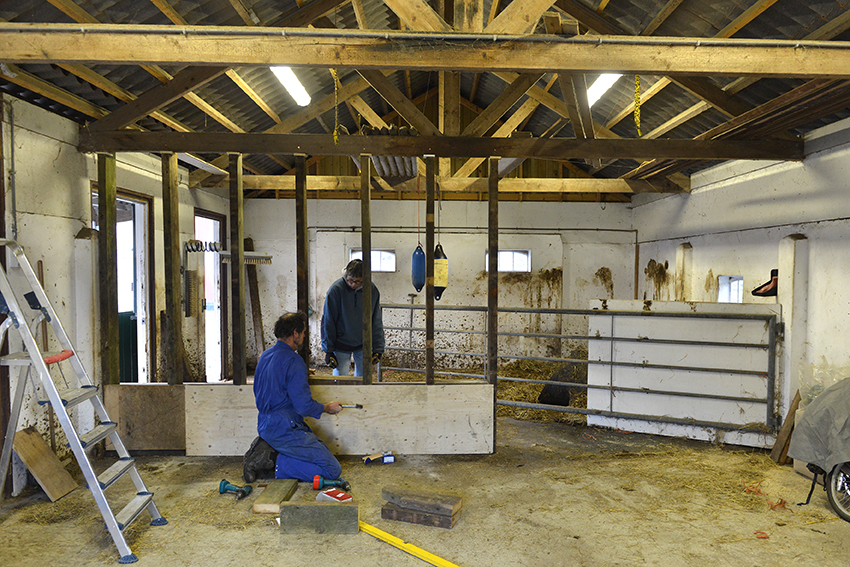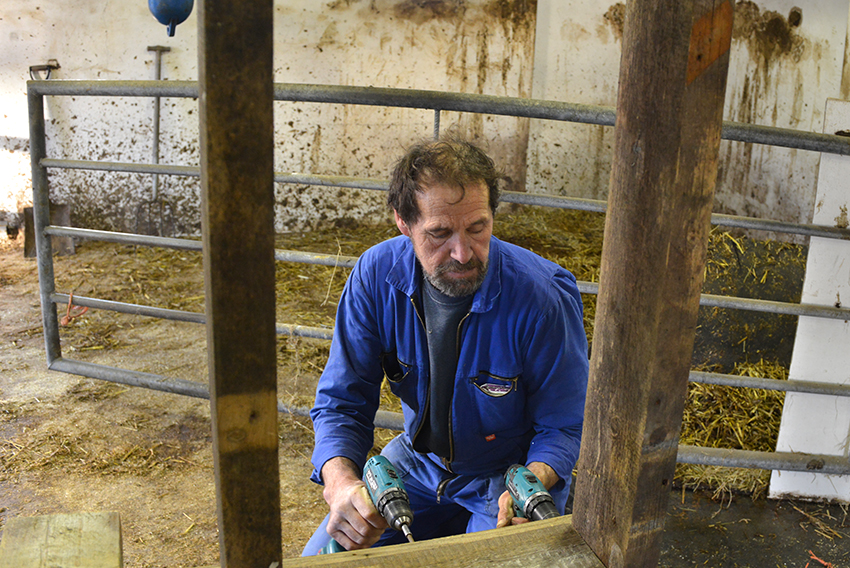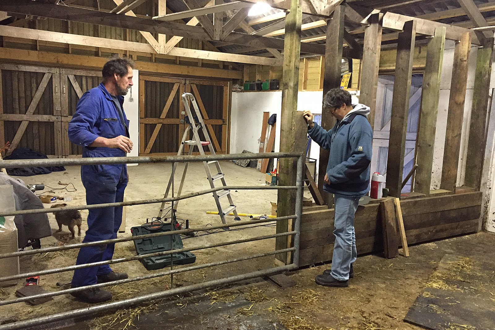 In de ossenstal wordt een nieuw voerhek gebouwd. Ossen-proof. Dit frame wordt er niet even uitgedrukt zeggen Inge en Henk tevreden.
