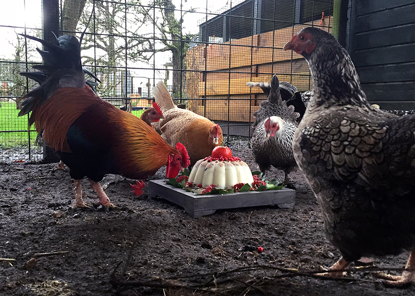 Er was er een jarig, hoera. Maar wiens verjaardag vieren we? Niet die van Hennie, de oudste en dapperste der kippen in huize Hens, hier lichtbruin in het midden van de foto met haar bek vol taart.