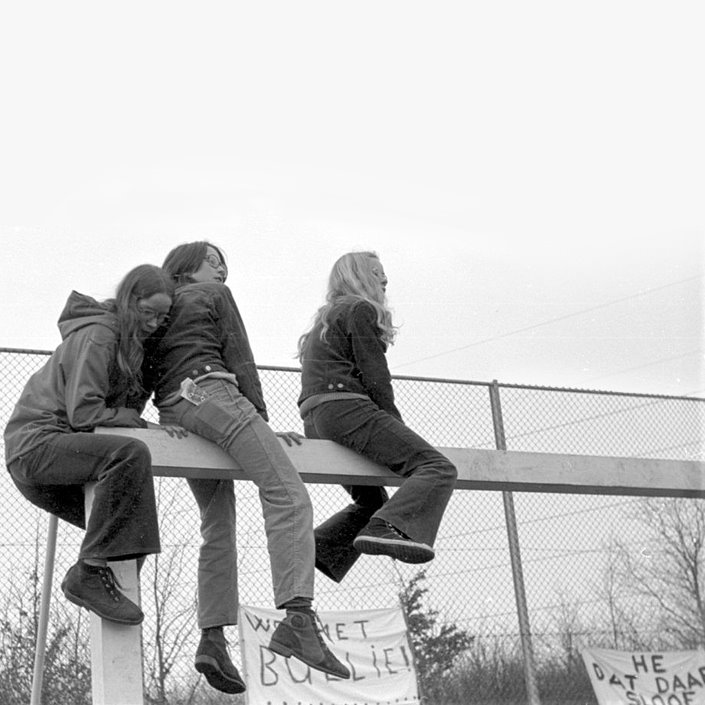 Leerkrachten tegen leerlingen, dus. En wij, supporters, zijn op het doel geklommen. ‘Wij’ is in dit geval, van rechts naar links, Ineke ‘Pukkie’ Plant, ikzelf en een meisje dat ik niet herken. Op zich is dat raar, want zoveel meisjes klommen niet op doelpalen. Misschien was ze van een concurrerende school? Want ik doe geen enkele moeite om een beetje op te schuiven.