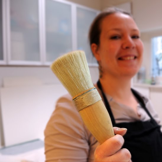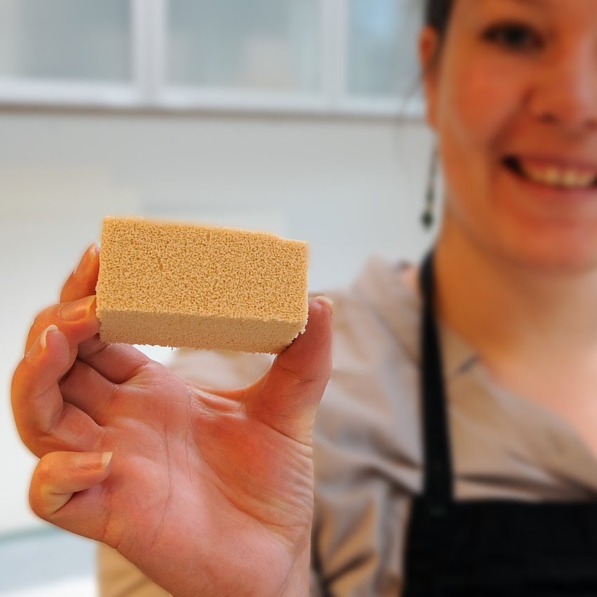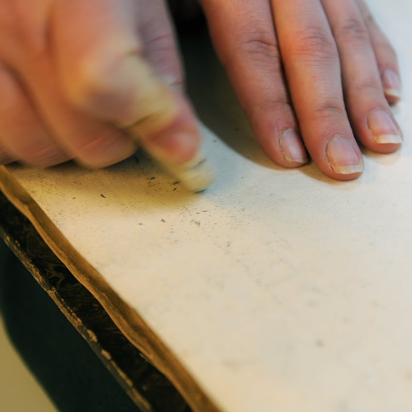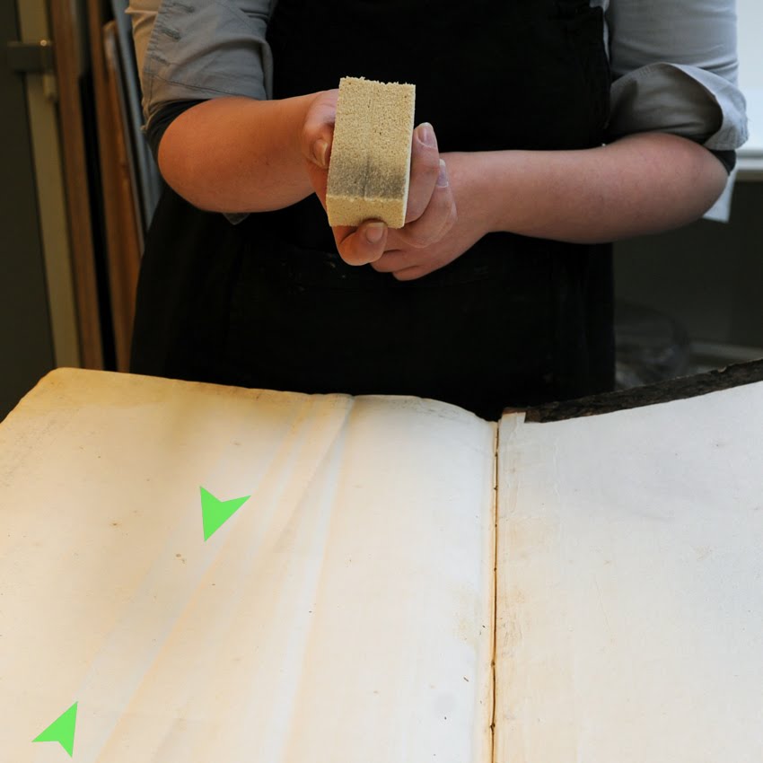 Daarna wordt met stukjes spons het papier schoongeveegd of -gewreven. Niet met een gewone huis-tuin-keukenspons, dit is een roetspons, van gevulcaniseerd rubber. Als het stukje aan alle kanten te vuil is, snij je een nieuw stukje af van de grote spons.