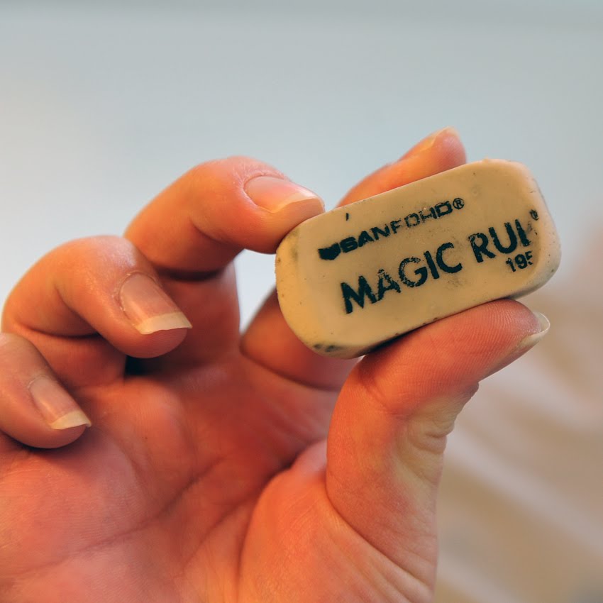 Geen gewoon gummetje natuurlijk. Alleen Magic Rub is goed genoeg.