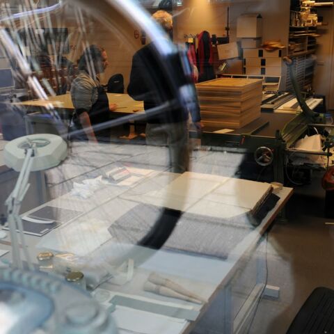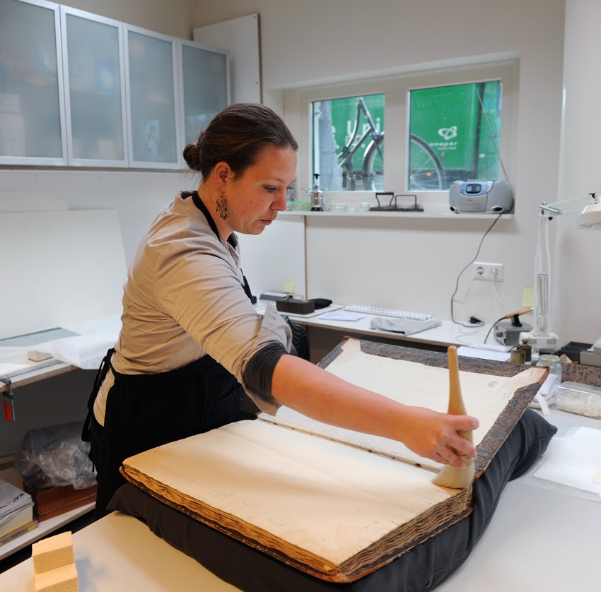 En zo gaat het verder – blad na blad, band na band. En als je geluk hebt, kun je de restaurator bezig zien in het sousterrain van het gebouw van de Bijzondere Collecties van de UvA..