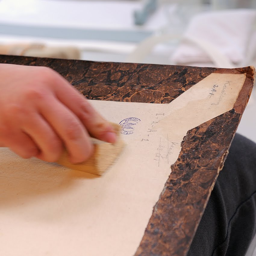 De eerste schoonmaak moet droog gebeuren, want technieken waarbij water komt kijken kunnen pas worden ingezet als het papier (zoveel mogelijk) schoon is. Als je een scheur plakt, gebruik je daar water bij. Wanneer er dan nog vuil rond de scheur zit, trekt het met ’t water mee in het papier en dan krijg je het er nooit meer uit.