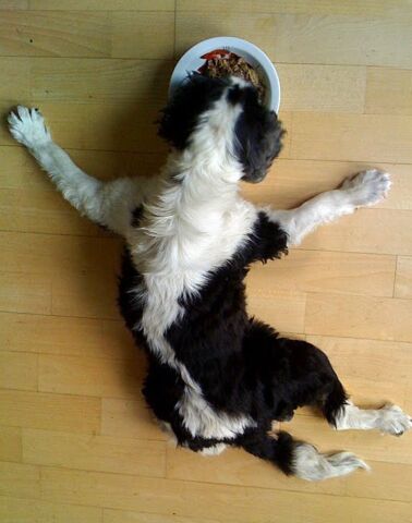 Als de vloer glad is, glijden Britta’s pootjes weg. De oplossing is eenvoudig: liggend eten. Met gestrekte poten en een bord als halo lijkt ze wel een beetje heilig.