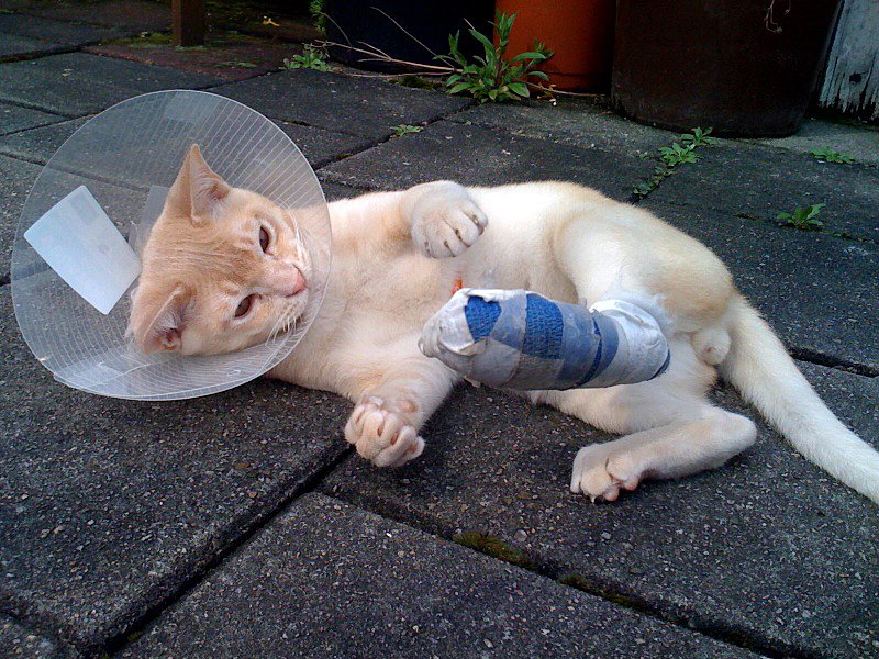 Vanochtend ging Chucky, tijdens ochtendspeelkwartier, opeens opvallend rustig op bed tegen mijn rug aanliggen. In een flinke bloedplas, bleek: hij bloedde als een rund uit zijn linkerachterpootje. En er waren bloedige afdrukken van zijn pootje en rode spatten door de hele slaapkamer (waarom leken die witte sprei en het witte kleed ooit een goed idee?). Met een tissue er omheen en wat druk uitoefenen werd het bloeden aanvankelijk gestelpt, maar na een half uur zat de keuken onder het bloed – op de vloer, op het tafelkleed, tegen de keukenkastjes gespetterd. Spoorslags naar de dierenarts dus, en die constateerde dat het weefsel tussen twee teentjes flink was ingescheurd (hoe? Hoe? HOE?). De scheur Moest onder narcose gehecht.