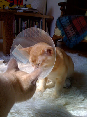 Toen de kap drie dagen geleden even af mocht begon Chuck meteen aan de zwarte draadjes tussen zijn teentjes te frunniken, maar nu likt hij dat pootje niet meer dan de andere, dus de kap blijft eraf. En morgenochtend om half negen mogen de hechtingen er eindelijk uit.