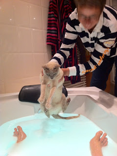 Chick bleef snorren – maar ze trok wel haar pootjes op toen ze het water eenmaal had gevoeld. En ja, ze bleef verder droog. Ze zit nu haar teentjes droog te likken. Ze vindt het niet erg dat ze woont bij mensen met zo’n ziek gevoel voor humor.