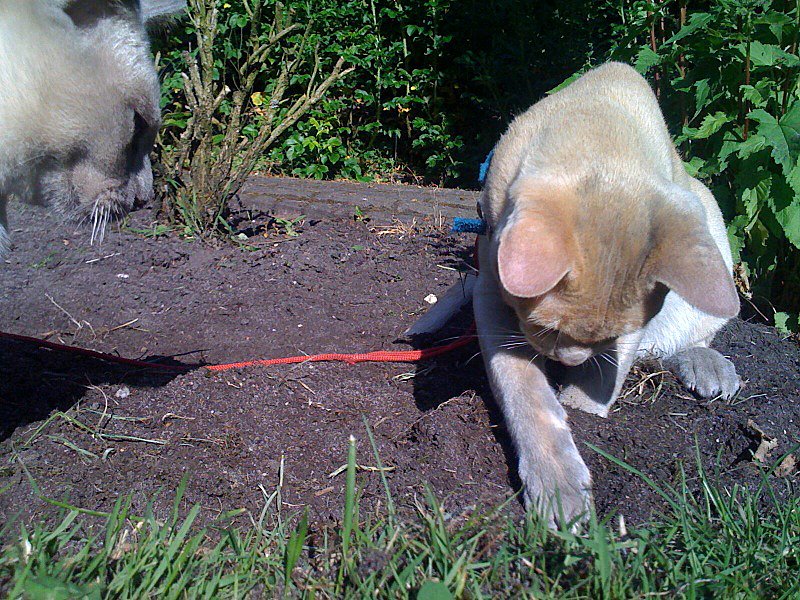 Had ik totnogtoe het idee dat Chick & Chucky propere poesjes zijn… blijken het tarkebakken in het kwadraat. In een perkje naast het grasveld hebben ze een lapje zwarte aarde ontdekt dat moet en zal worden omgeploegd. Poten, buik en snuiten raken donkergrijs en smoezelig.